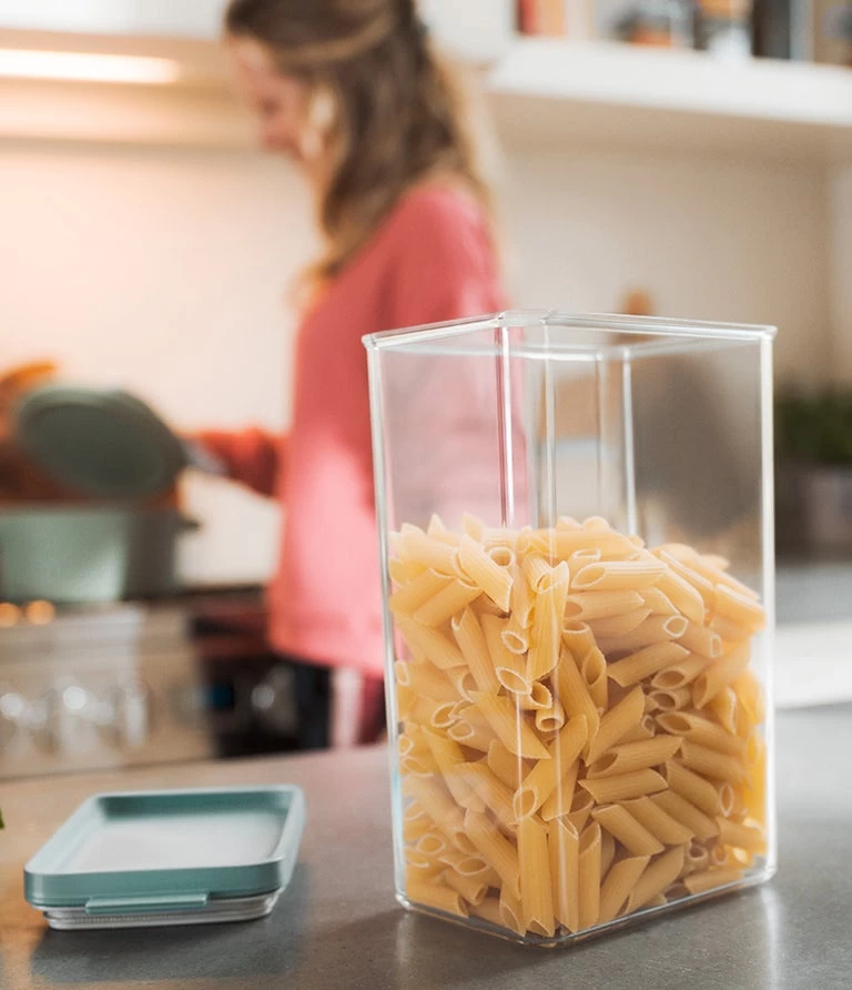 De Omnia rechthoekige bewaardoos in Nordic White helpt je graag met het bewaren van alles wat je lekker vindt: van geurige koffie tot krakende cornflakes. Deze bewaardoos, met een inhoud van 2000 ml, is ruim en slim, sluit perfect af en kan prima tegen een stootje. Bovendien laat hij zich makkelijker stapelen dan ooit. Het stijlvolle Nordic White maakt hem een mooie decoratie op het keuken schap of aanrecht. Dus zoek je een fraaie oplossing voor een beetje extra ruimte in je overvolle leven? Gevonden!