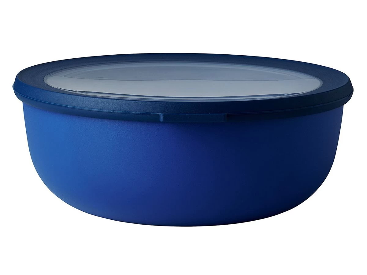 Mepal Cirqula multikom 2250 ml in de kleur Vivid blue. Deze blauwe schaal met een inhoud van 2250 ml is perfect voor het bewaren of meenemen van grote porties soep, vlees of maaltijdsalades. De Cirqula serie van Mepal is speciaal ontwikkeld voor een complete ‘circle of use’. Bewaar eten in de schalen in de koelkast of de vriezer, warm het op in de magnetron (deksel moet worden verwijderd) en serveer je maaltijd in de schaal (direct) op tafel. De Mepal Cirqula multikom is gemaakt van robuust materiaal. Het transparante venster in de deksel zorgt ervoor dat de inhoud goed zichtbaar is. De innovatieve, soepele deksel is luchtdicht en lekvrij. Hierdoor blijft voedsel langer vers en kan het perfect bewaard en meegenomen worden. De Mepal Cirqula multikommen zijn praktisch en gemakkelijk op te bergen omdat je ze op elkaar en in elkaar weg kunt zetten.