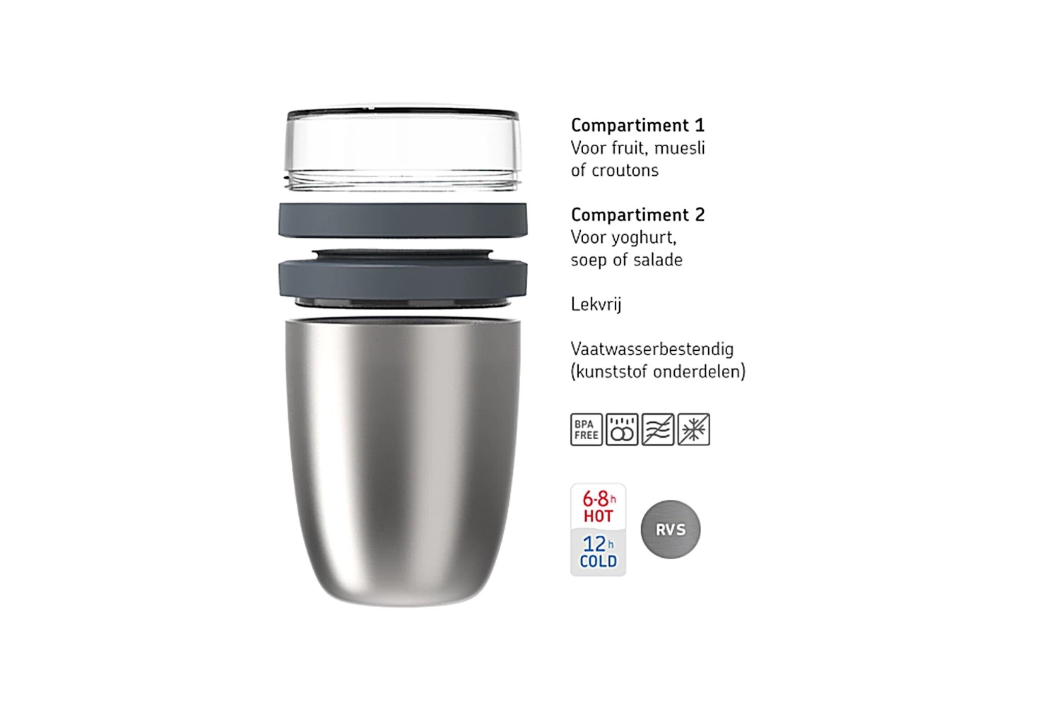 Natuurlijk is de isoleerpot 100% lekvrij en blijft de buitenkant koel en droog, hoe warm of koud de inhoud ook is. Beide compartimenten hebben hun eigen deksel, die op en van elkaar gehaald kunnen worden met een simpele twist. De deksel van de isoleer lunchpot heeft ook een isolerende functie en kan dus niet zomaar gewisseld worden met de deksel van onze reguliere yoghurtbeker. Om zolang mogelijk van je product te kunnen genieten raden wij aan de gekleurde thermoslunchpot met de hand af te wassen. De kunststof onderdelen van de dop mogen wel gewoon in de vaatwasser.