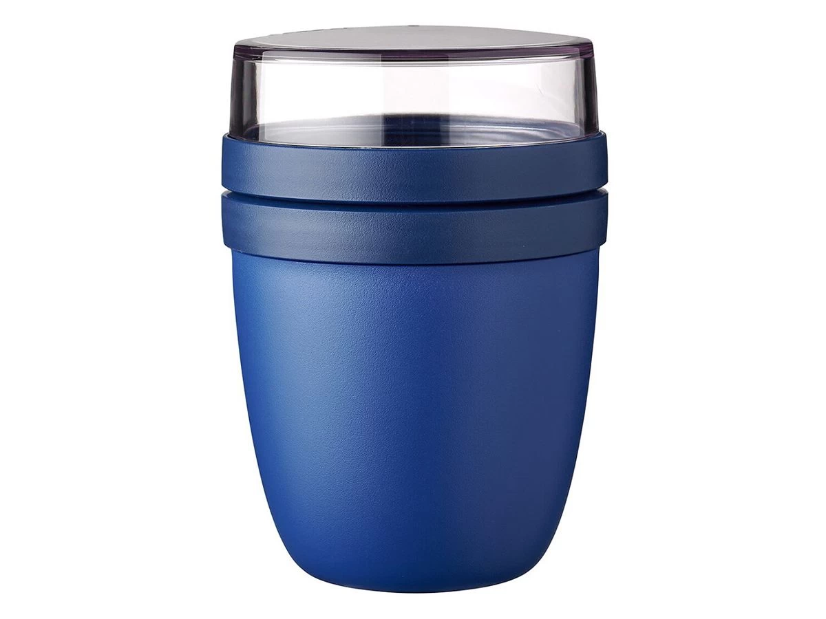 De beide containers hebben een aparte deksel en blijven daarom ook schoon. Bovendien passen de deksels op beide containers, dus je hoeft ’s ochtends niet op zoek naar de juiste deksel. De inhoud van de bovenste transparante container is 200 ml, dit betekent dat er ongeveer 75 gram muesli of fruit in past. De capaciteit van de onderste container is 500 ml, genoeg voor een royale portie soep, noedels of yoghurt. De lunchpot is gemaakt van duurzaam materiaal en mag gebruikt worden in de vriezer, de magnetron (verwijder wel de deksel) en vaatwasser. De bovenste transparante container mag niet gebruikt worden in de magnetron.