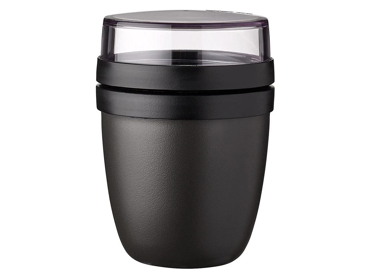 De Mepal lunchpot Ellipse Mini – 420 ml Black is één handig product om je lunch of tussendoortje mee te nemen, maar heeft twee verschillende compartimenten om de verschillende ingrediënten gescheiden te houden. Bijvoorbeeld de yoghurt en de muesli of fruit zitten in een aparte container, waarbij de deksel van de yoghurtbeker niet de bodem van de mueslicontainer is. Door middel van een eenvoudige draaibeweging scheid je de twee compartimenten om de ingrediënten te mixen. Dé oplossing om geknoei tijdens het mengen te voorkomen. De beide containers hebben een aparte deksel en blijven daarom ook schoon. Bovendien passen de deksels op beide containers, dus je hoeft ’s ochtends niet op zoek naar de juiste deksel.
