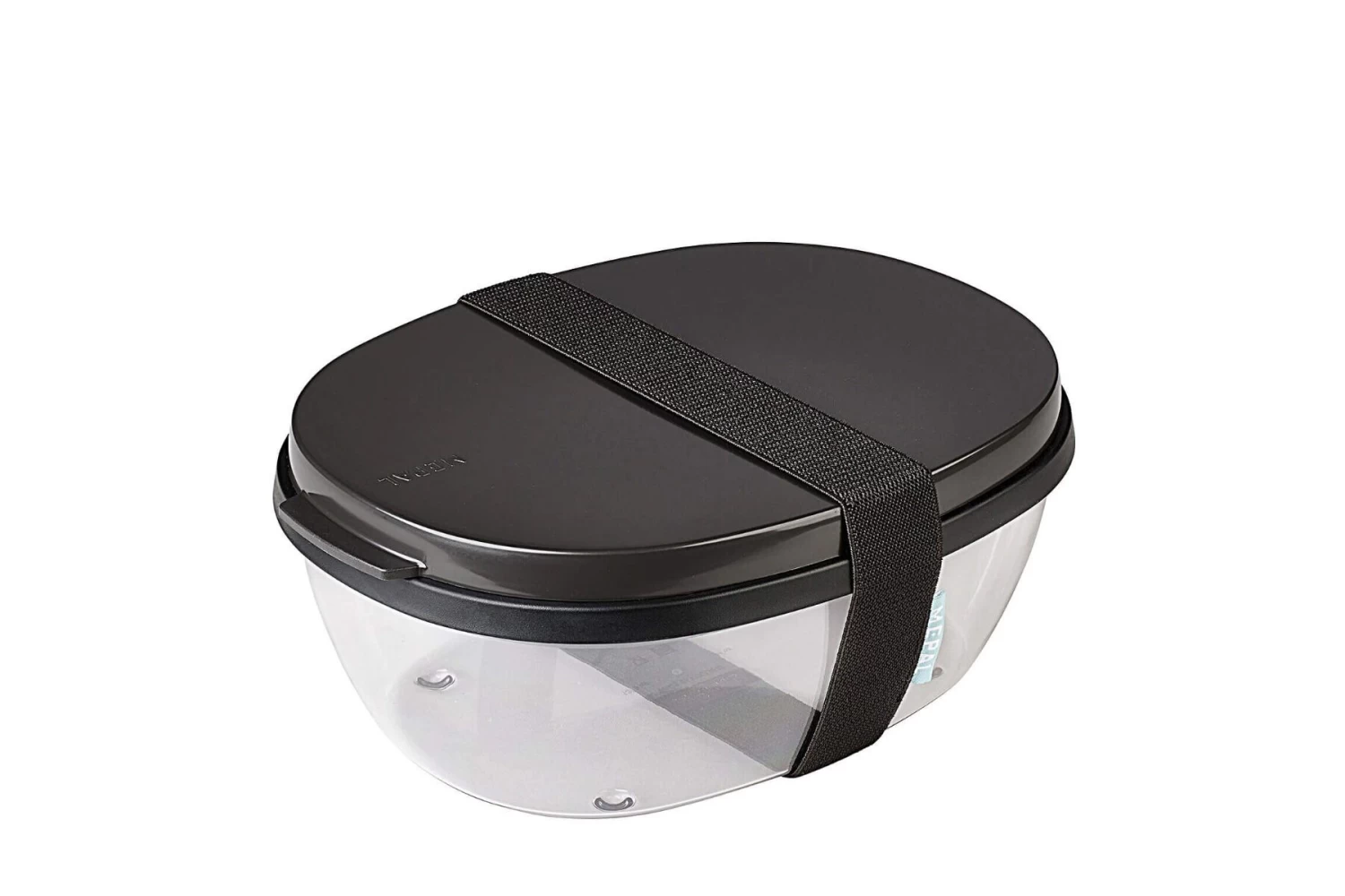 Saladbox Ellipse in de kleur Vivid black. Deze saladebox van Mepal is groot genoeg voor een (maaltijd)salade. De transparante box heeft voldoende ruimte om de salade op het moment van eten te mengen.
