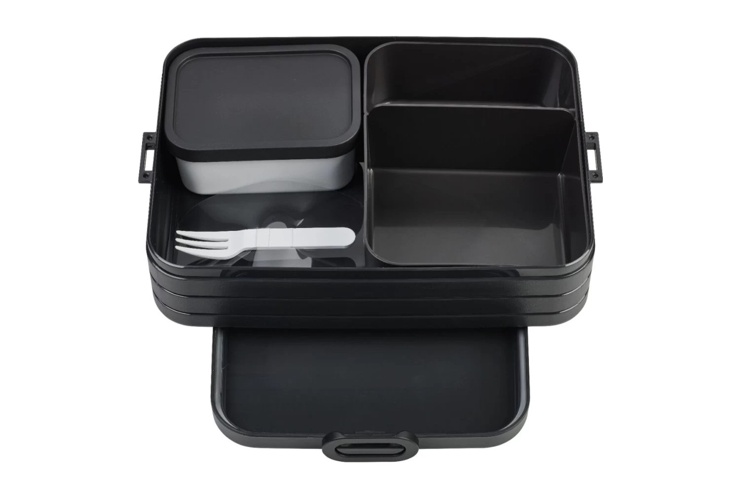 De Mepal Tab Large Bento lunchbox is vervaardigd uit Nordic Black, zwart, kunststof. De Bento lunchbox heeft een lengte van 25,5 cm, een breedte van 17 cm en is 6,5 cm hoog. De lunchbox wordt geleverd met een dubbele inzet, een apart afsluitbaar bakje en een vorkje.