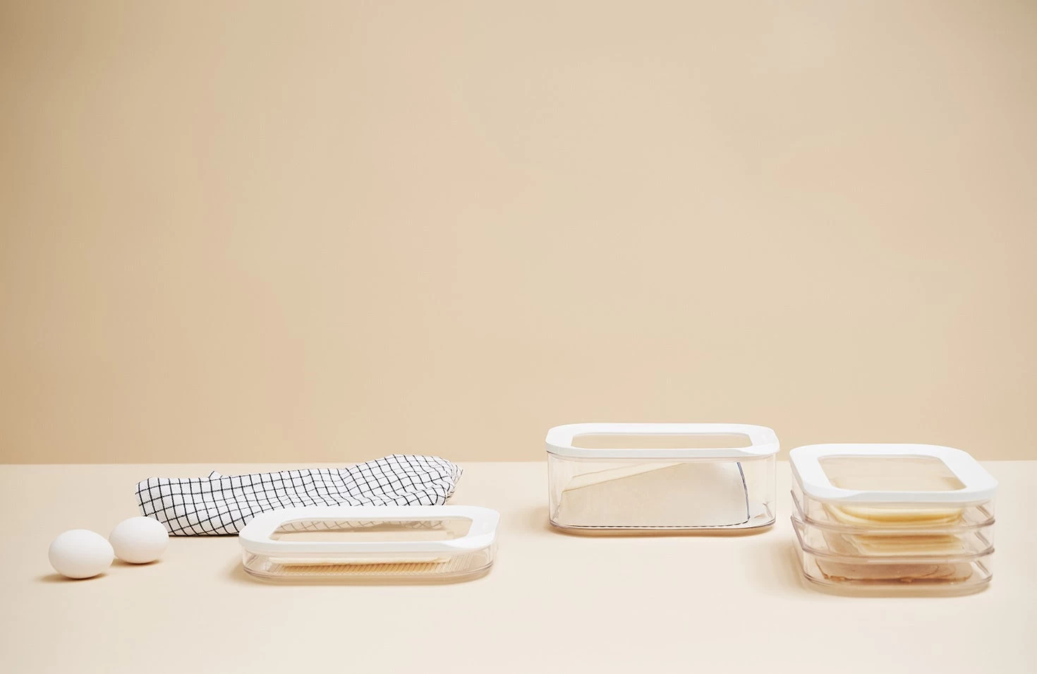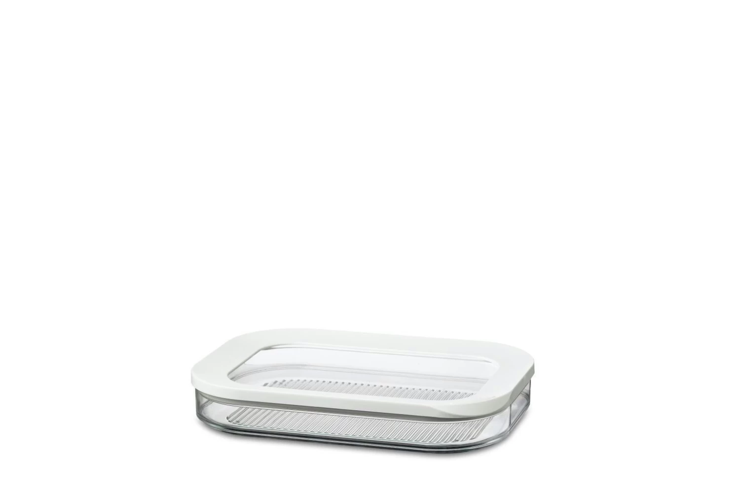 Vleeswarendoos Modula 550/1, voorzien van een doorzichtige deksel met witte ring. De rechthoekige Modula vleeswarendoos met afgeronde hoeken heeft een inhoud van 550 ml en geeft direct zicht op inhoud, ook in de koelkast!